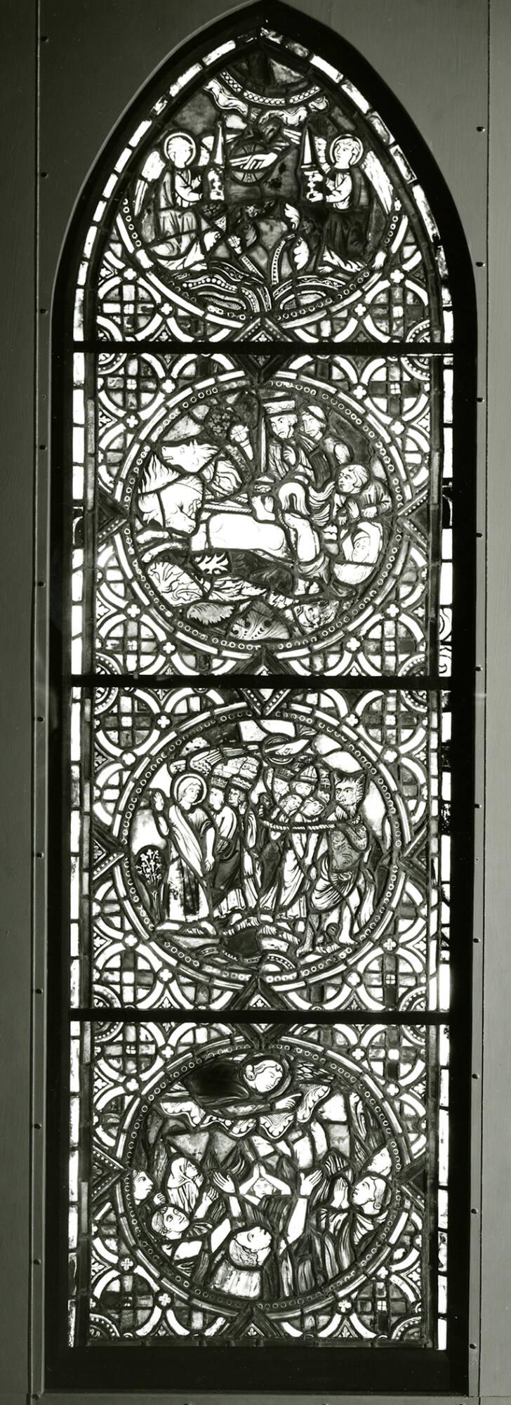 DescriptionLancet panel. Four medallions: "Glorification of God"; "Horseman of Apocalypse"; "Last Judgement"; "Sinners in Hades".