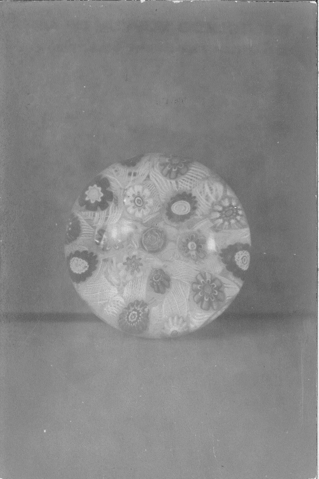 DescriptionHot-tooled. "Spaced millefiori" paperweight; colorless dome enclosing polychrome canes on white filigree ground; "Clichy" rose in center.