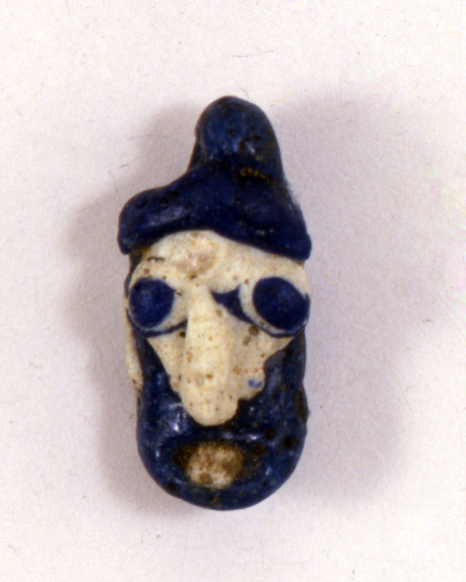 DescriptionPendant in the likeness of a bearded male head. Dark blue ground with an opaque white irregular face; dark blue hair, rounded beard, and vertical suspension ring; opaque white lips, nose, and possibly ears (mostly lost); opaque white eyes outlined in dark blue with dark blue centers. Cylindrical shape.