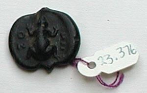DescriptionRound amulet made of amber-brown glass. Decorated on one side in relief with a toad, flanked by the letters ON and SZ. Pierced with two longitudinal holes. Surface shows chipping.