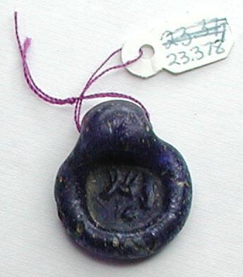 DescriptionRound amulet made of translucent dark blue glass. A ring is present at the top for suspension. One side features a raised design.
