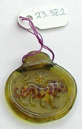 DescriptionRound flat amulet made of translucent amber-yellow glass. Molded in relief with a lion walking to the right, with a star above its back. A loop at the top allows for suspension.
