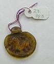 DescriptionTranslucent amber yellow glasswith ring for suspension. Representation in relief of a walking lion.