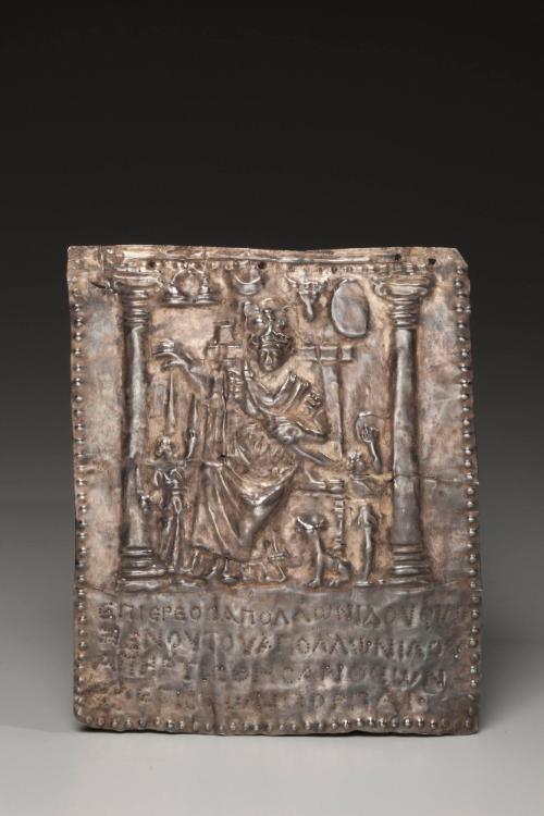 DescriptionA rectangular silver votive plaque featuring a dedication by a certain Apollonides, son of Philoxenos. The upper portion depicts a seated figure, enthroned within an architectural frame supported by Corinthian columns. Small attendants flank the figure, one raising a circular object. A small animal, possibly a panther or dog, sits before the throne.