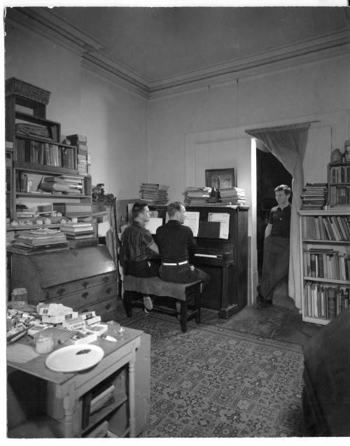 Untitled (Paul Cadmus and Jared French (seated at the piano) with George Tooker standing in the doorway), from a collection of 33 photographs of members of Lincoln Kirstein's circle