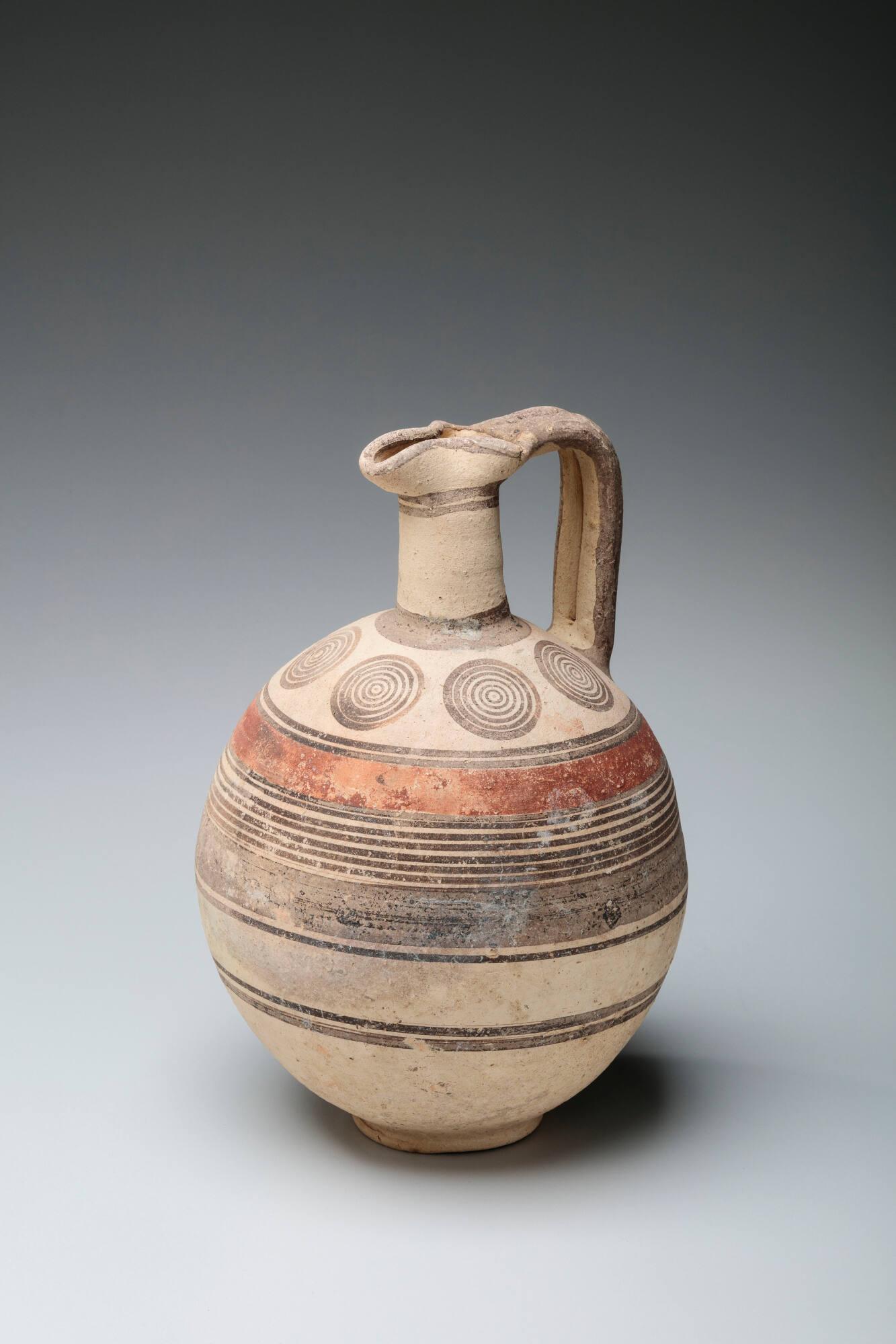 DescriptionThis is a wheel-thrown earthenware jug with an applied handle. It has a globular body that tapers to a small foot, a cylindrical neck, and a prominent trefoil, or three-lobed, mouth designed for pouring. The decoration is painted in red and brown slip. Three large concentric circles are painted on the shoulder, and the neck and body are decorated with horizontal bands of varying thickness. The object is recorded as intact, though slightly worn with some loss of slip. A "kiln bump" is visible on the shoulder next to the handle