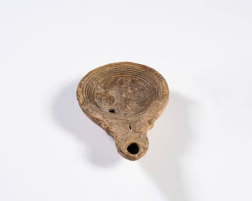 DescriptionThis is a small, round oil lamp made of terracotta. On the top, a winged figure—likely the Roman goddess Victory—is shown in raised relief. She holds a shield that once may have been inscribed with a seasonal greeting. The lamp has a spout at one end for a wick and was designed to burn oil. It is typical of Roman lamps made in the 2nd century CE and was likely used during New Year celebrations.