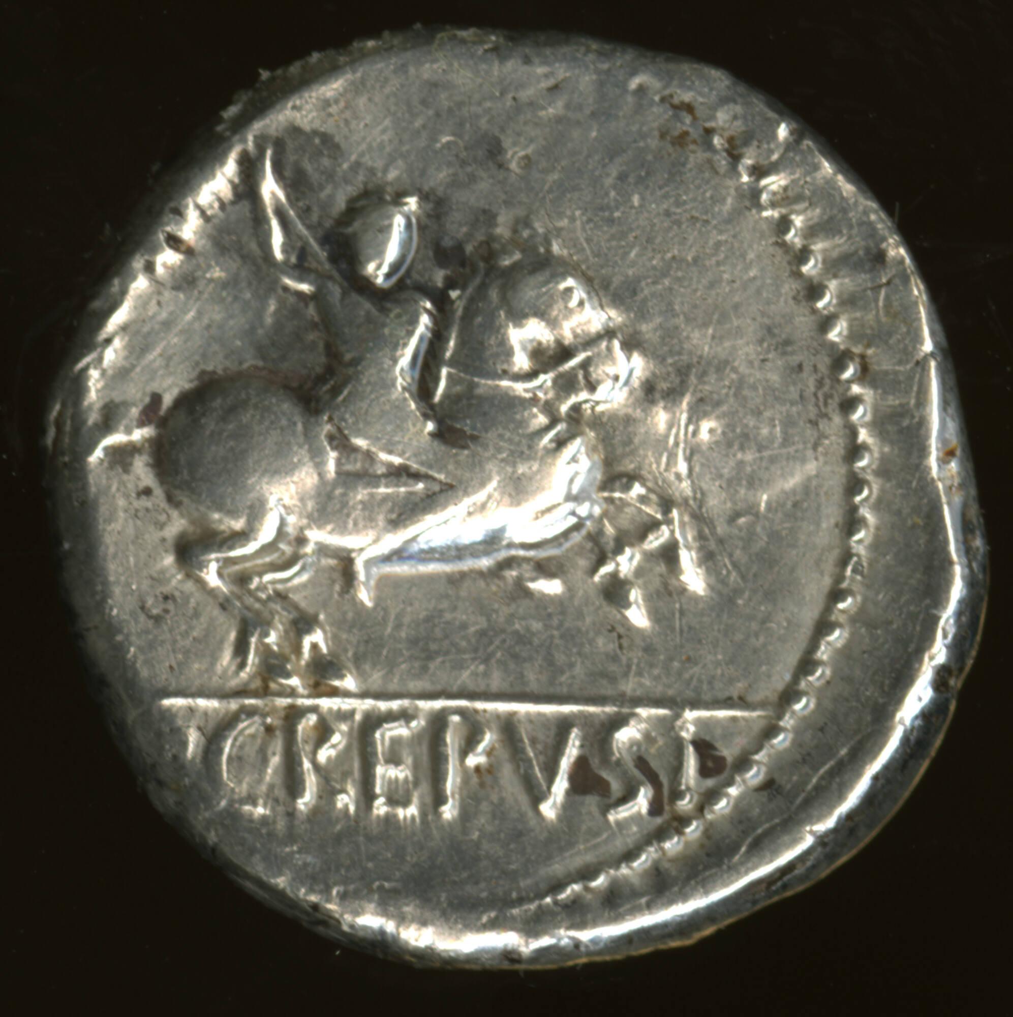 Reverse: P. CREPUSI (in exerque). Horseman galloping to the right, hurling spear; behind, number ?.