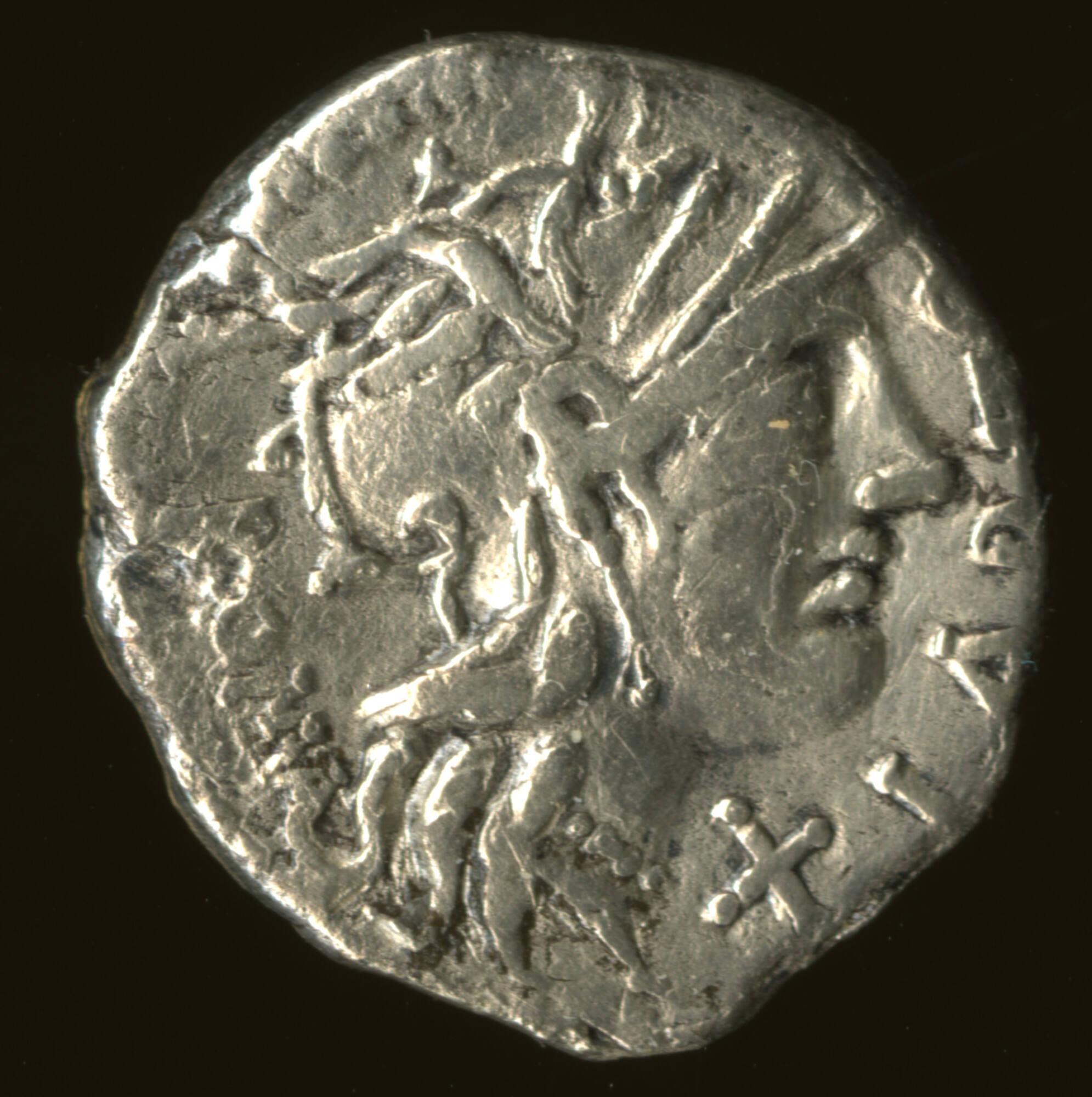 DescriptionObverse: Head of Roma in winged helmet, facing right; under chin: X; before head: LABEO; behind: ROMA.