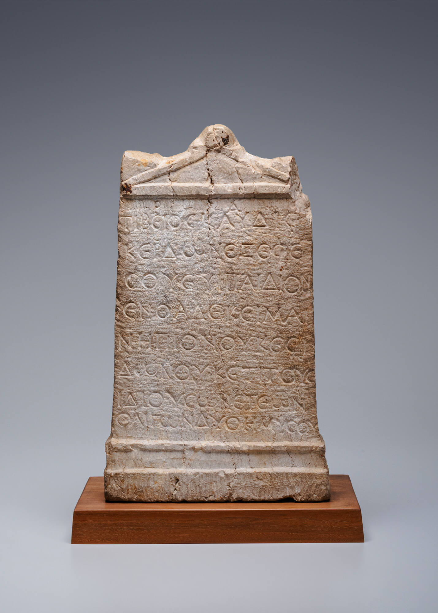 DescriptionA rectangular vertical stele carved from stone (likely marble) featuring a pedimental top with a central akroterion. The surface bears a ten-line Greek inscription incised in a serifed, monumental style. The lettering is consistent and fairly well-cut. The stone is broken roughly at the bottom below the final line of text. The inscription is a funerary epitaph for a child named Tiberius Claudius Kerdon. Translation as follows: "I, Tiberius Claudius Kerdon, of Ephesus ----lie here. A child, not yet having looked upon my relatives, being of few years, two and a half."