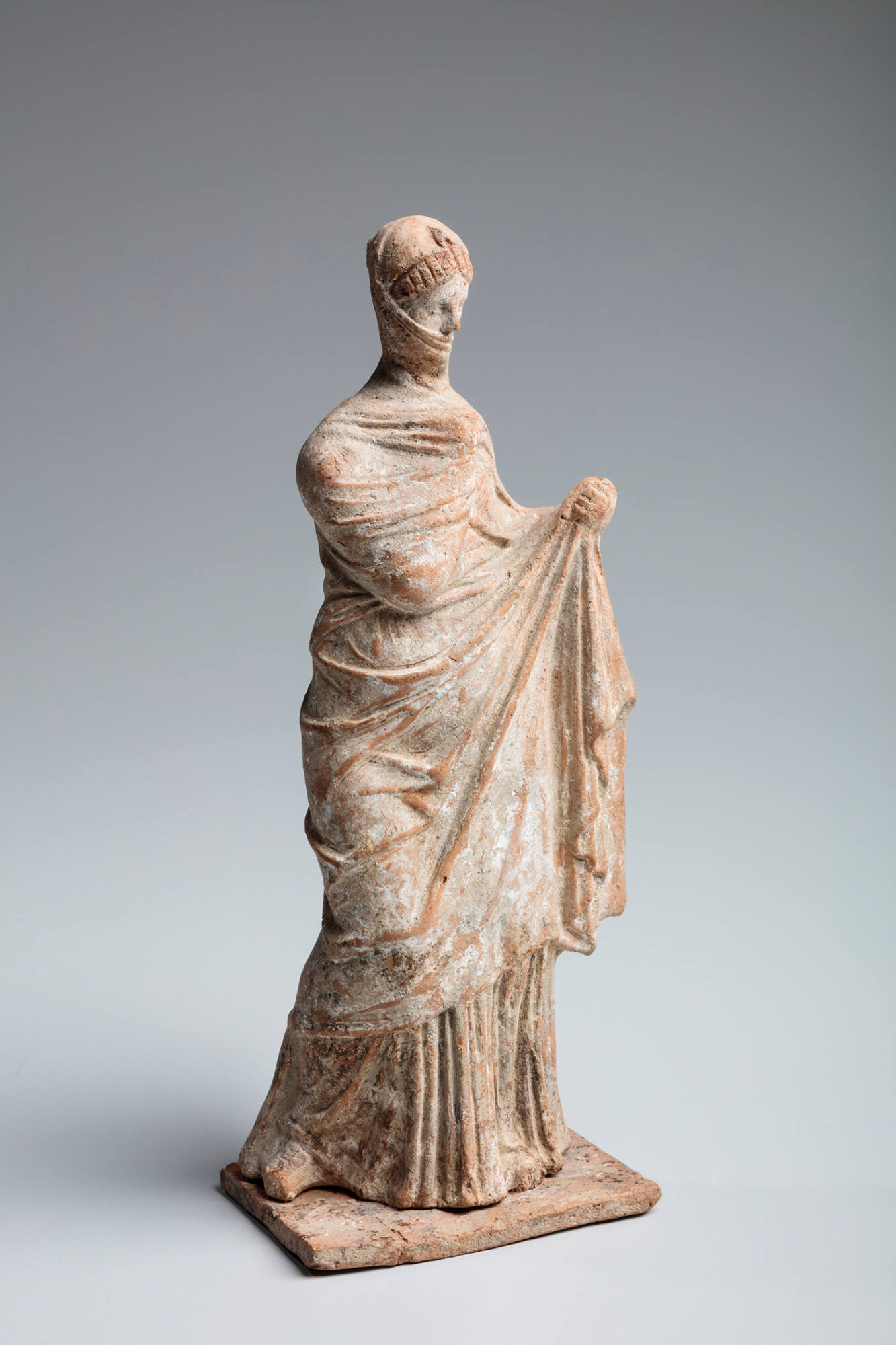 Label TextSimultaneously concealed and revealed by her tightly draped cloak, this statuette shows a woman of high rank on a journey of some sort. Greek aristocratic women led extremely sheltered lives and were required to cover themselves whenever leaving the house (see nearby case “Women in Ancient Athens”). In 1871 French excavators discovered more than 8,000 tombs outside the city of Tanagra in Boeotia, about 35 miles north of Athens. Half of the tombs included terracotta statuettes representing not only gods but also everyday depictions of women, like this example. These figurines were instantly dubbed “Tanagras” and became a collecting craze throughout Europe.mid-5th century BCE