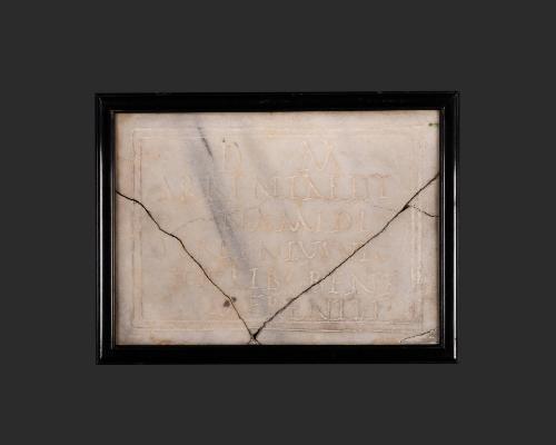 DescriptionRectangular marble plaque inscribed in Latin. Inscribed "D M