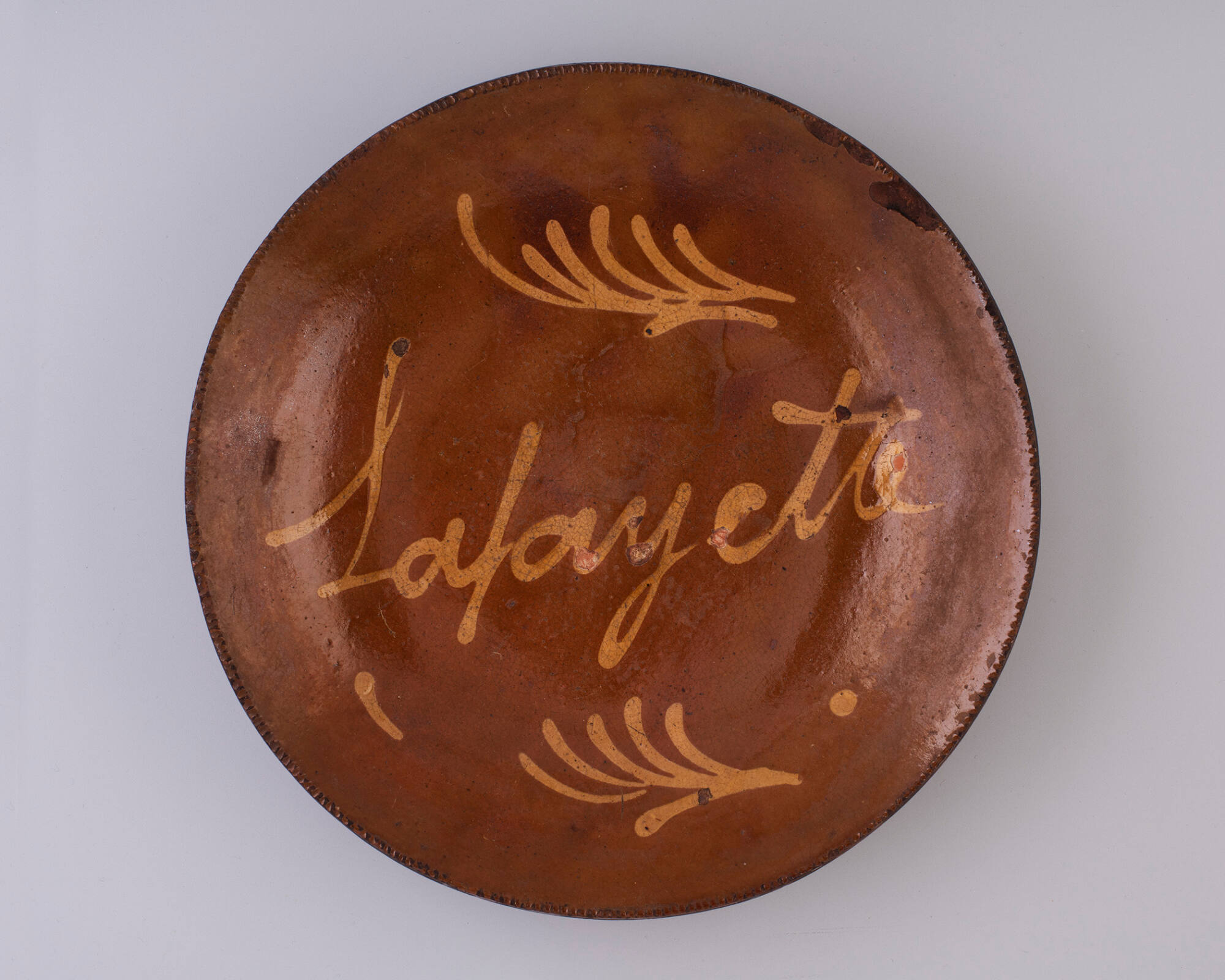 DescriptionBrown glaze with yellow slip decoration.