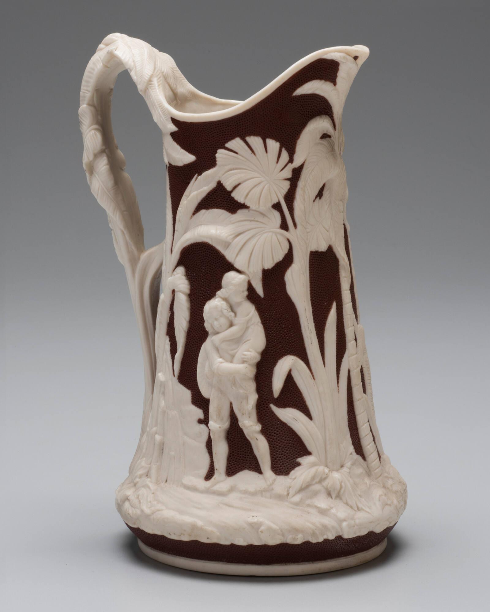 DescriptionMolded with relief decoration against a brown orange peel background. Glazed interior.