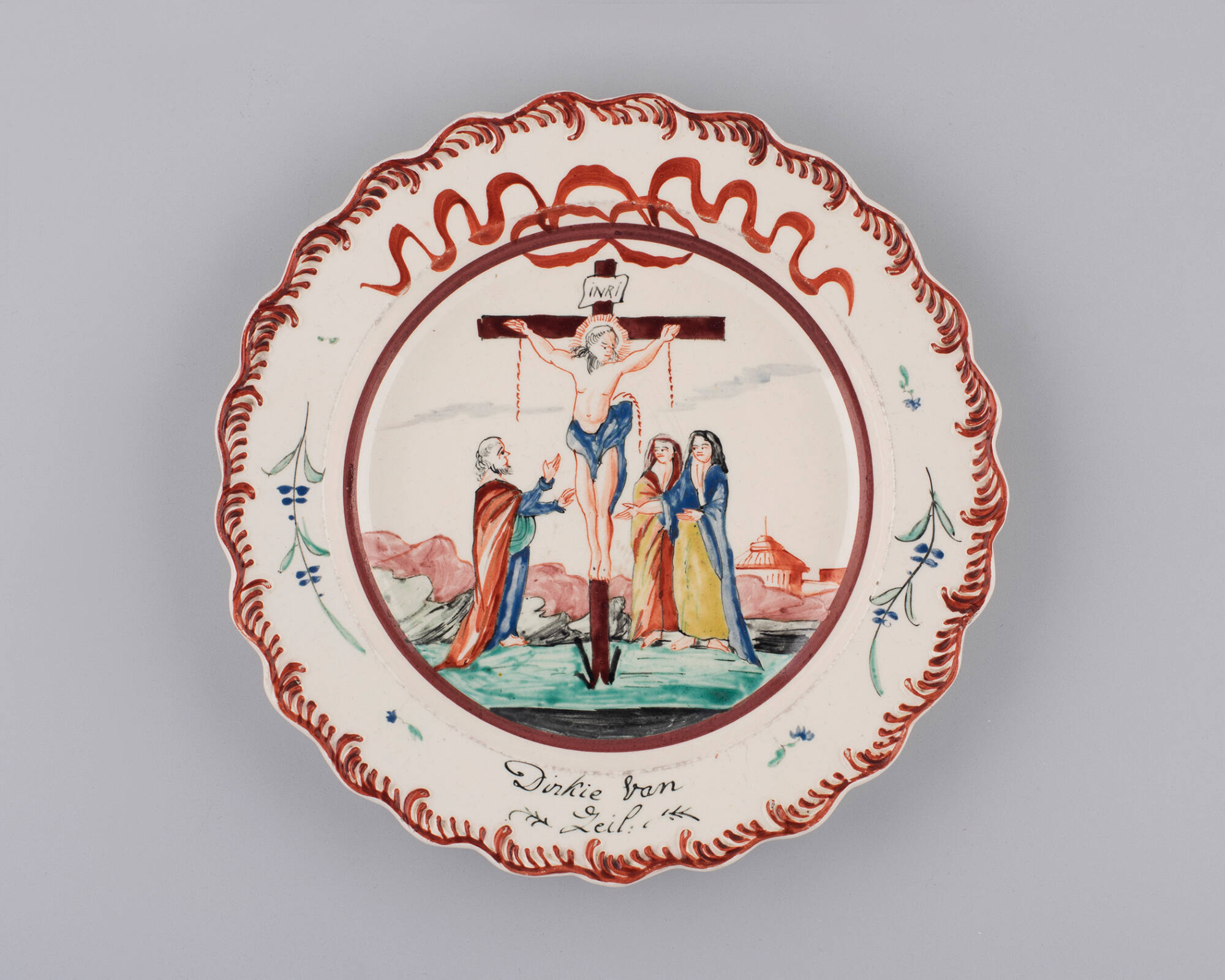 DescriptionRaised scroll border in red. Crucifixion in the center.