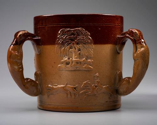 DescriptionEarthenware (stoneware); Brown earthenware - two shades. Figures in relief. 3 handles.