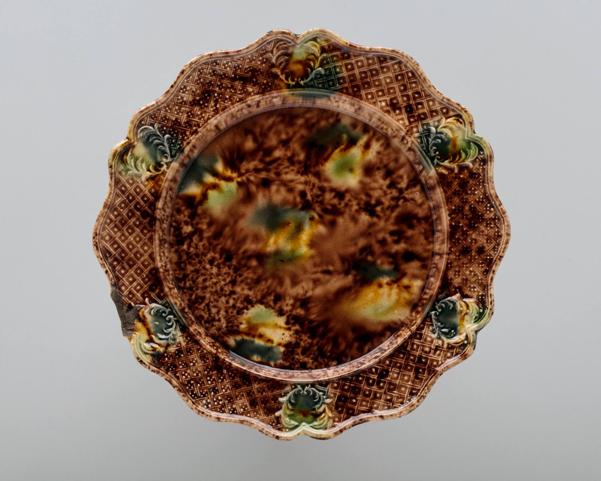 DescriptionGreen and brown. Conventional design in relief on scalloped border.