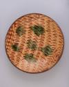 DescriptionRope knotched rim; yellow tin marble slip decoration on a dark-red-brown ground. Six green glaze slip splotches in center.
