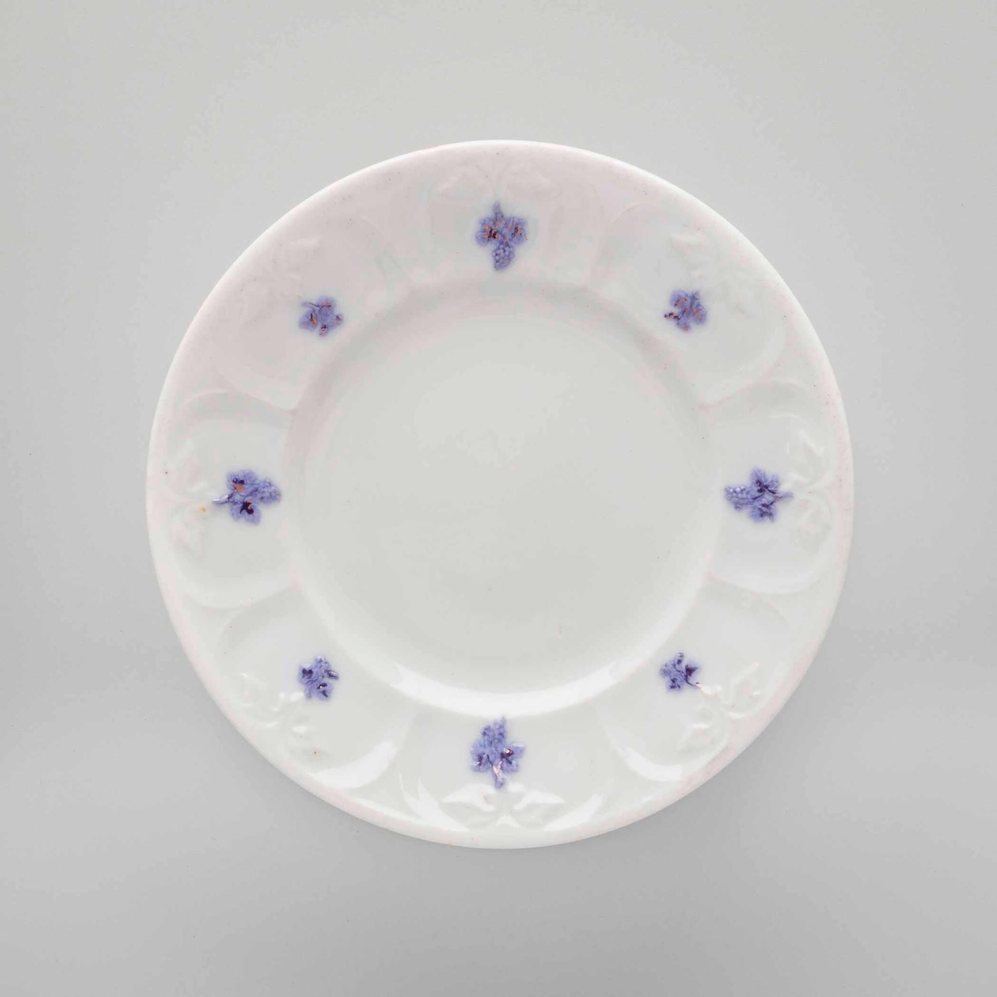 MediumEarthenware (ironstone); White pottery with sprigs in relief of grapes and leaves painted violet with touches of lustre. Some relief uncolored.