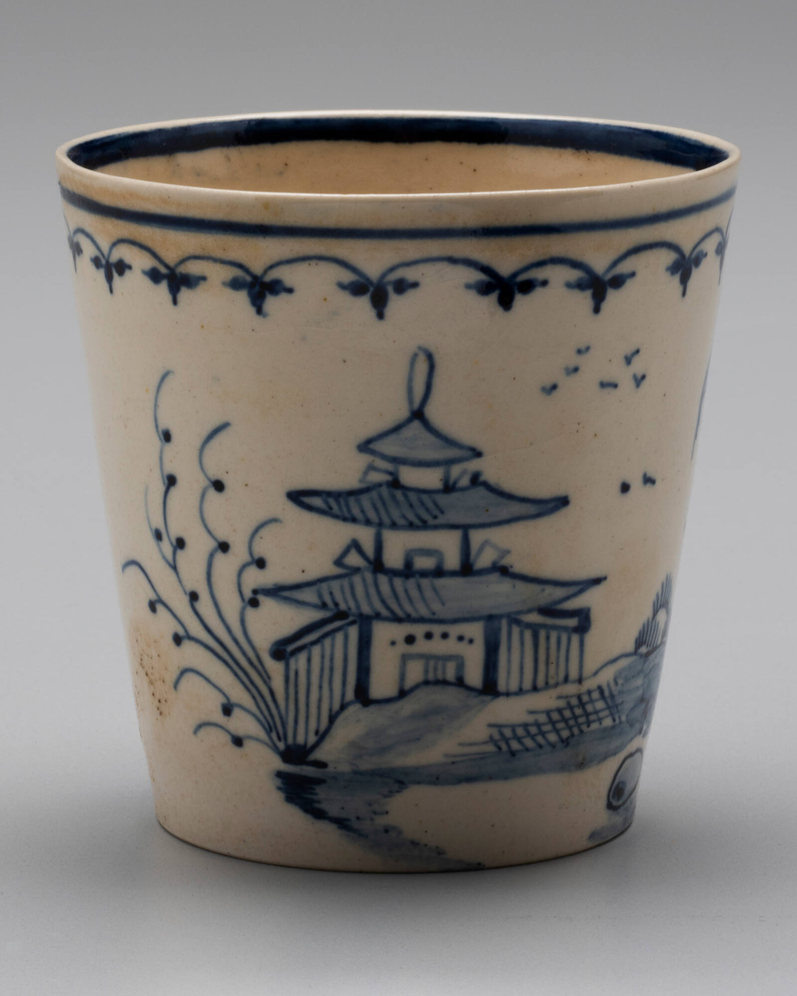 DescriptionEarthenware (creamware) with blue painted scenes.
