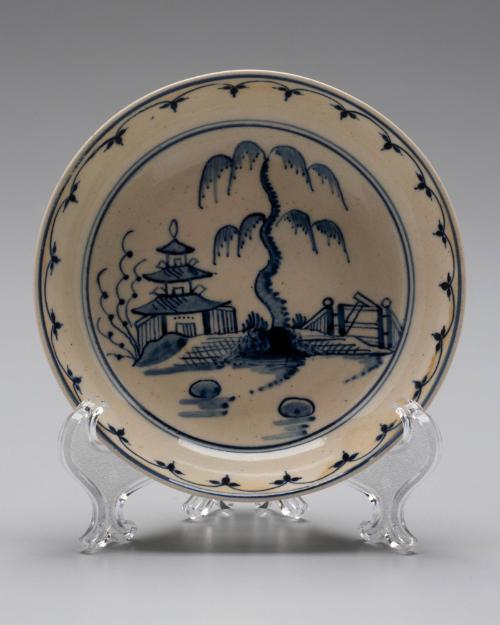 DescriptionEarthenware (creamware) with blue painted scenes.