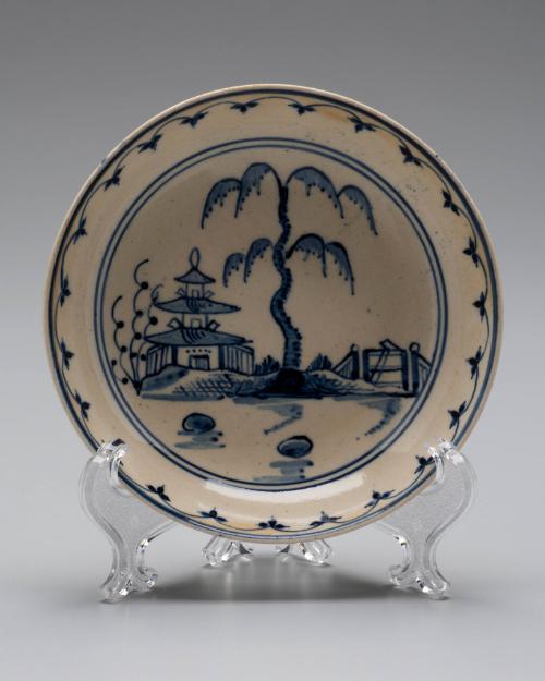 DescriptionEarthenware (creamware) with blue painted scenes.
