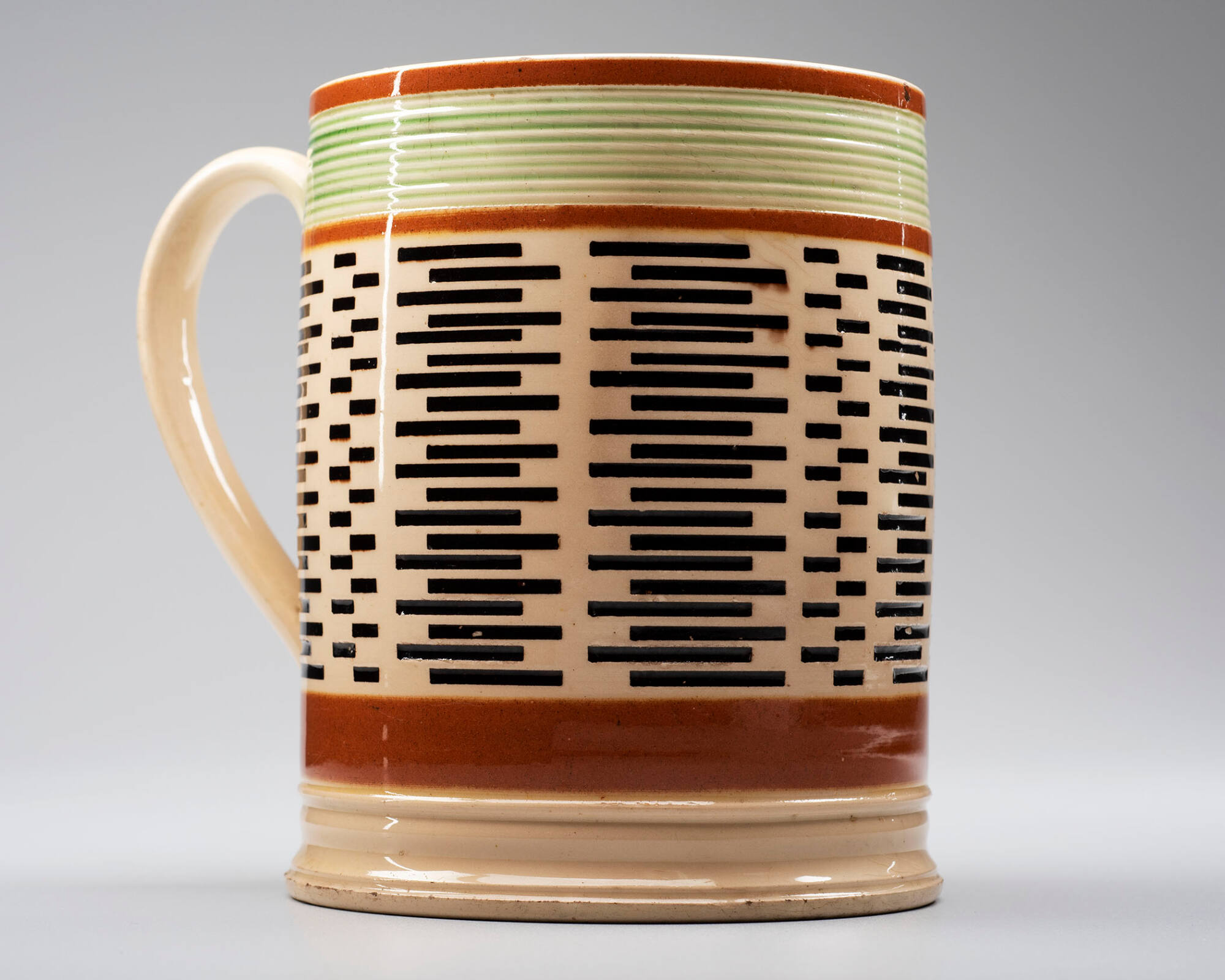 DescriptionMocha-type, green glaze in incised areas. Brown glaze at top and bottom band.