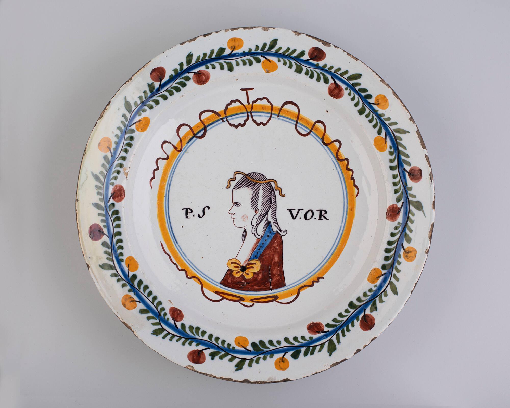 DescriptionWhite tin glaze with painted polychrome decoration