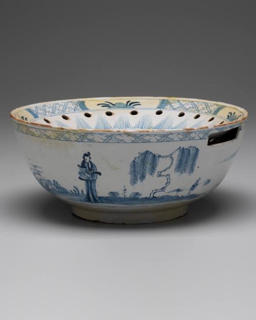 DescriptionGrey-white tin glaze decorated in blue with landscapes, figures, and motifs.