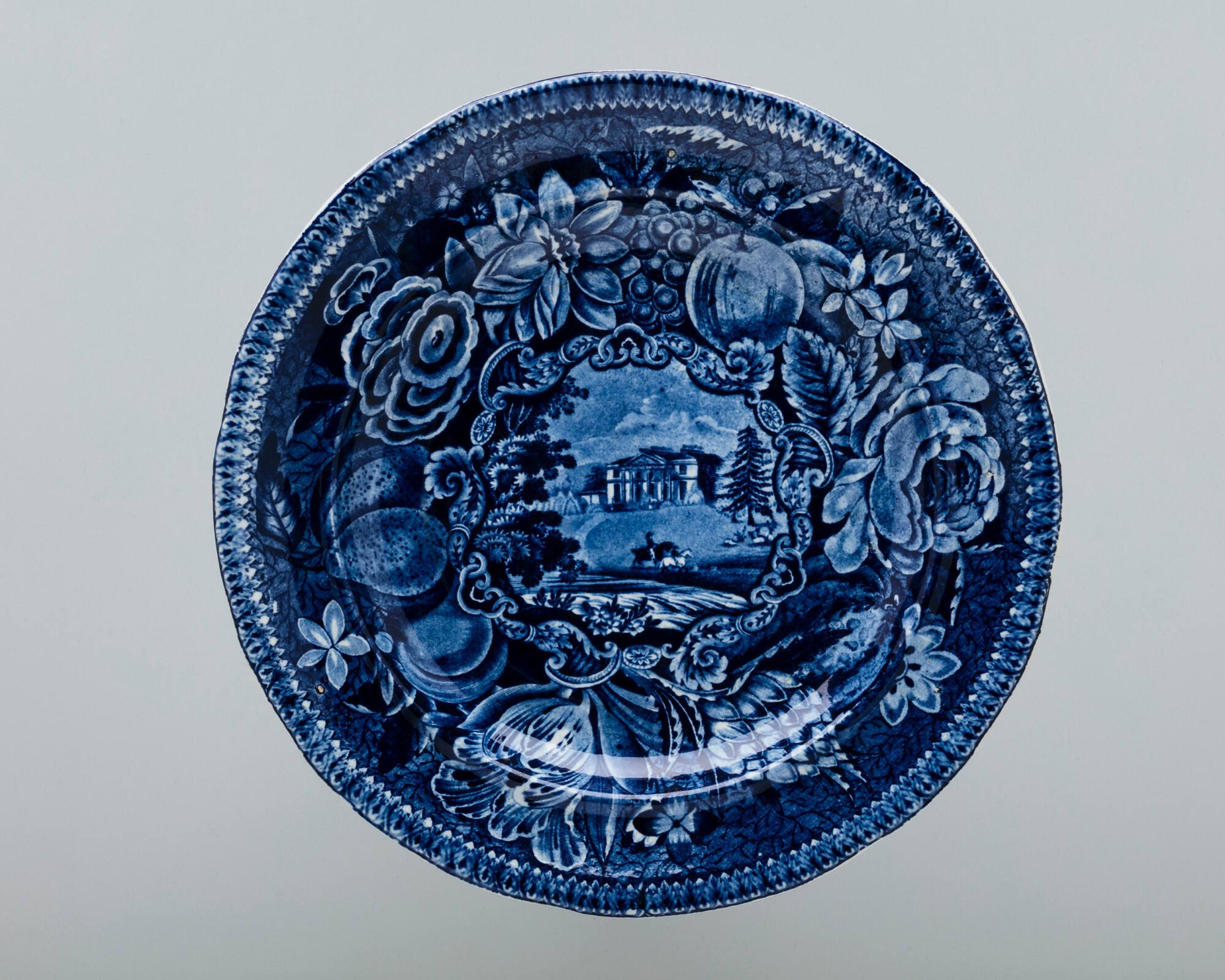 DescriptionBlue printed ware. Floral border enclosing Pains Hill, Surrey