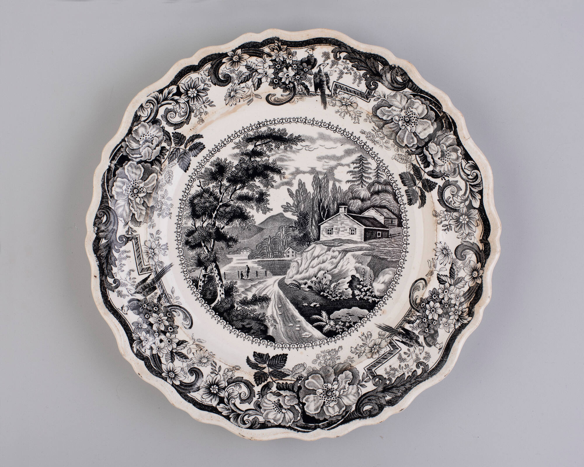 DescriptionBlue printed. Foliage and tree border. Country place in center.