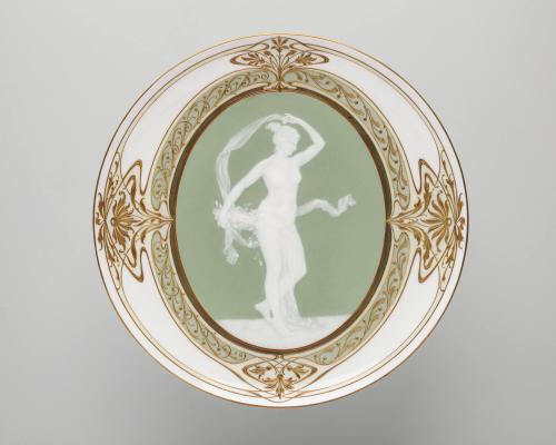 MediumPorcelain; White with gold and green decoration. In center, female figure in white pate-sur-pate on light green ground. Highly glazed.