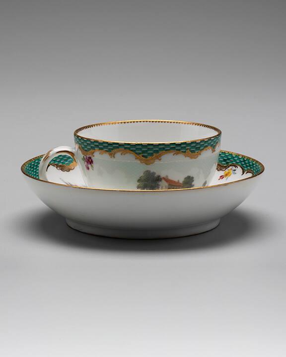 DescriptionGreen and white block border outlined in gold scrolls, landscape inside saucer.