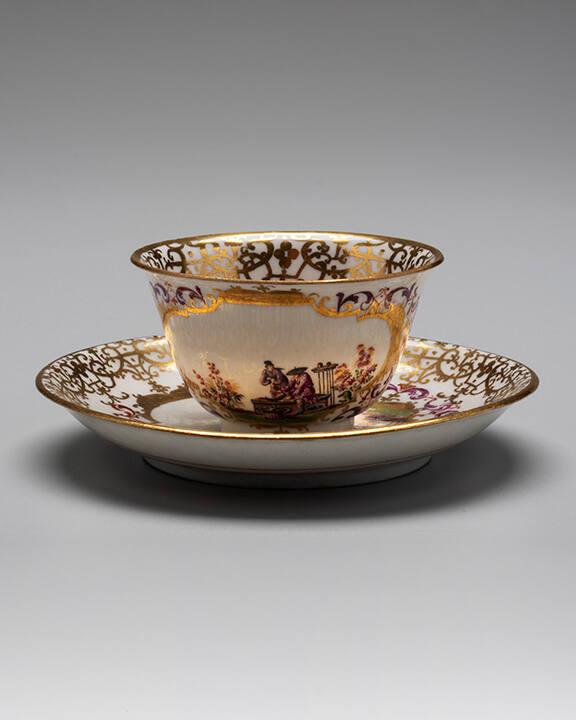 DescriptionDecorated in gold with panels containing Oriental scenes in brilliant colors. No handle on cup.