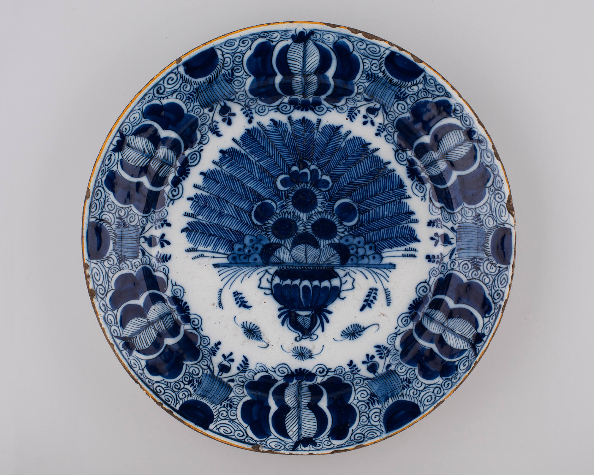 DescriptionTin glaze. "De Prceleyne Claeuw". Circular, with "camaieu bleu" decoration