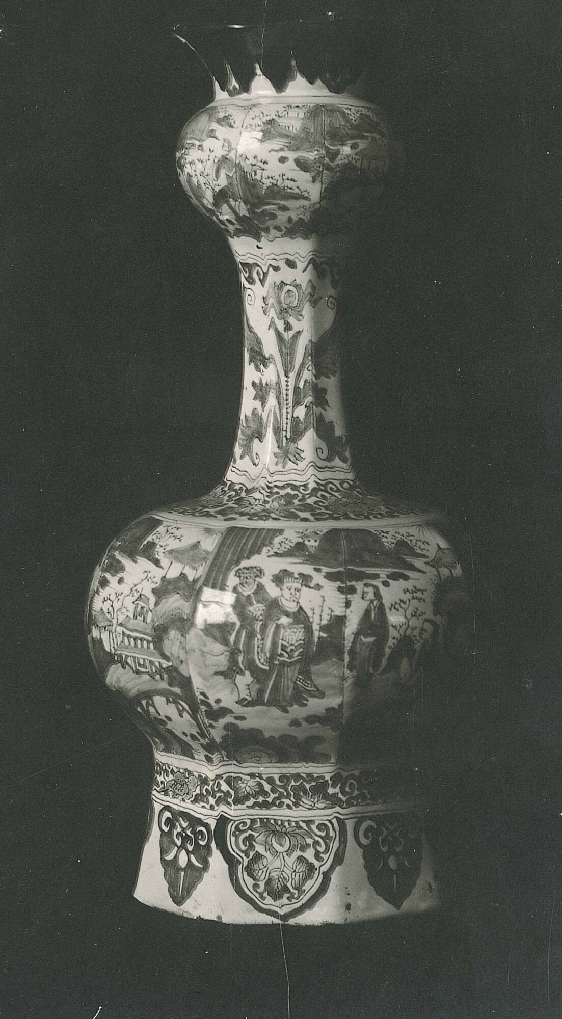DescriptionGlazed earthenware. Asian shape with asian decoration painted in blue on lighter blue.