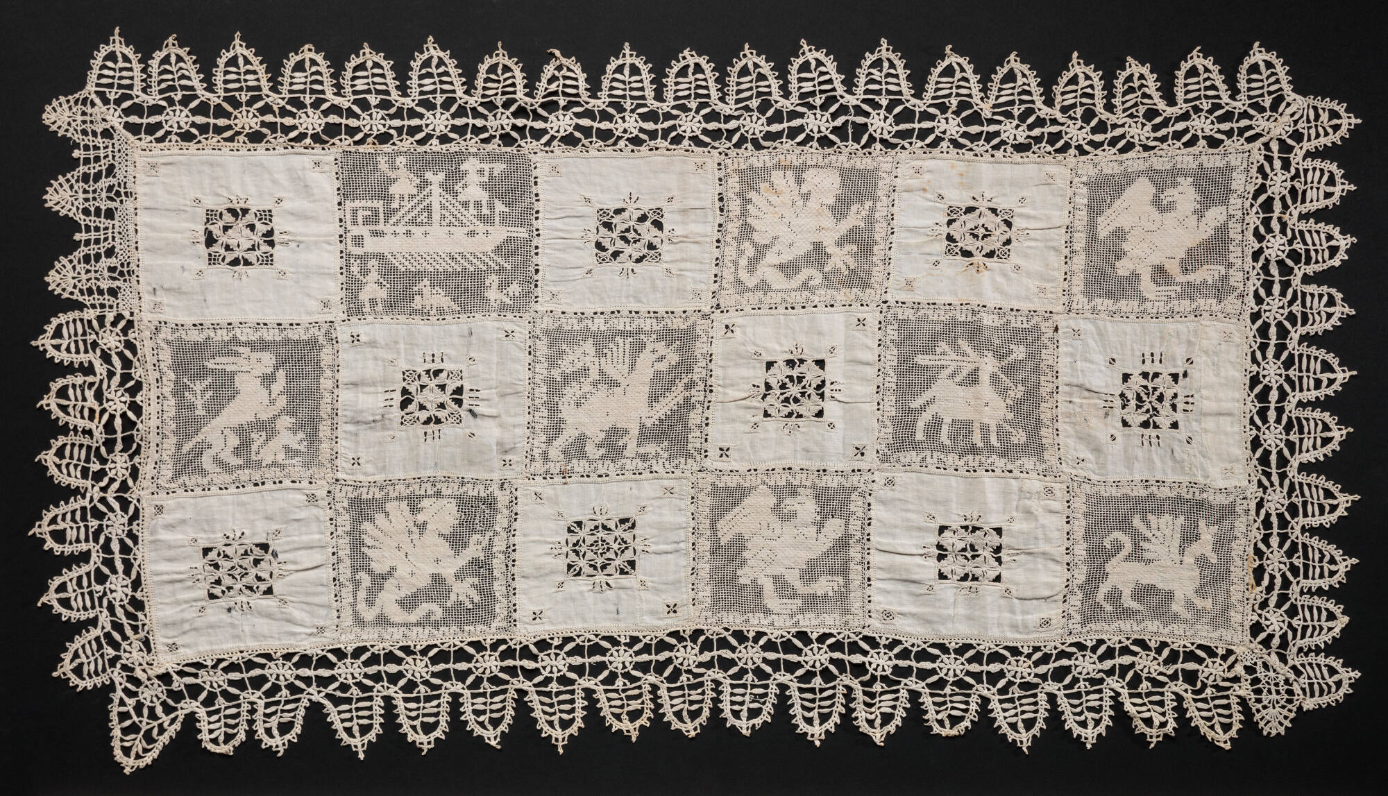 DescriptionThis rectangular linen cover is constructed of alternating squares of punto a maglia quadra (lacis or filet in French) and reticella (cutwork) needle lace. The punto a maglia quadra ground uses punto a tela (linen or cloth stitch) to create the figural designs. The cover is trimmed with a punto in aria and a braid-based reticella. Punto a maglia quadra laces were used for altar covers, curtains, coverlets, and design features on albs, a liturgical vestment.