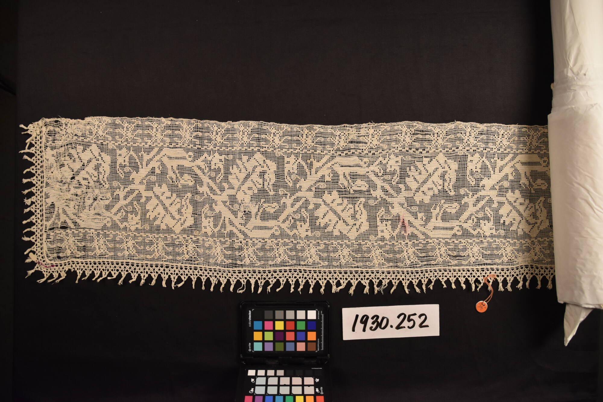 MediumBuratto; a length, with formal running vine pattern. Lower edge and ends finished with pointed and fringed pillow lace.