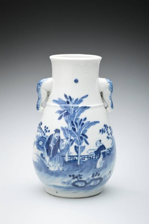 DescriptionBlue and white ware. Three figures in a garden. Two elephant heads as handles.