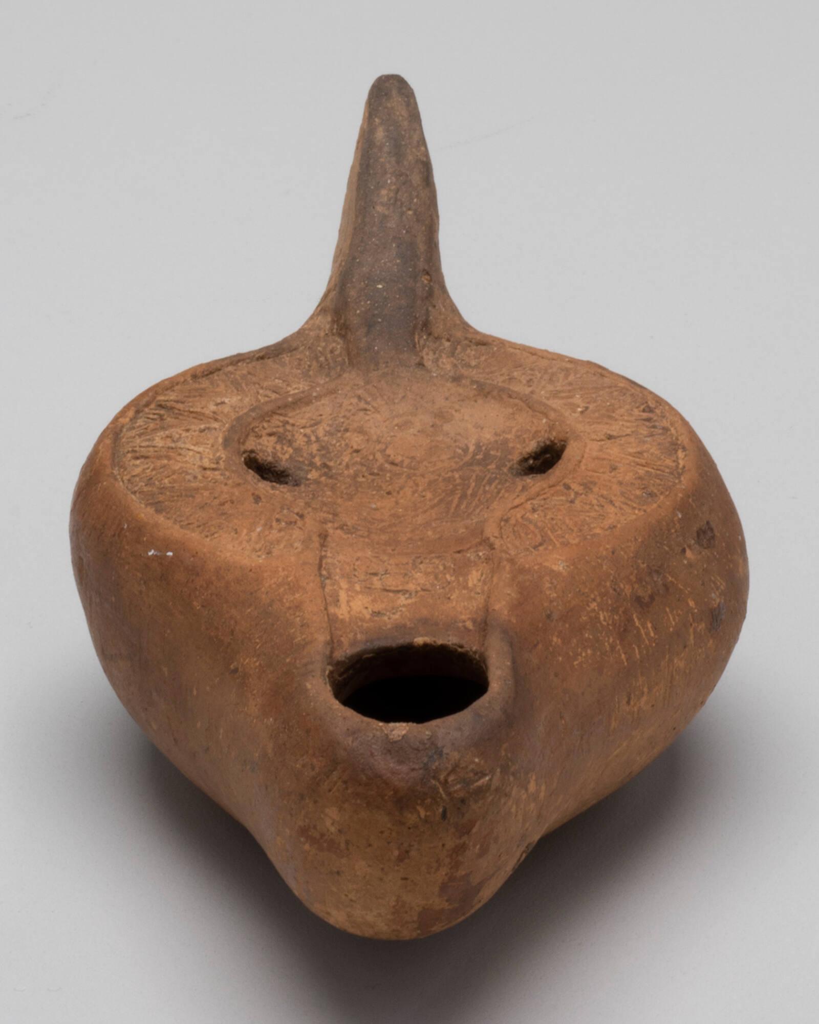 Label TextThis lamp was made in North Africa during a time when Christianity was spreading through the Roman Empire. Molded from reddish clay and decorated with slip, it features a cross and the bust of a bearded man, possibly Saint Peter. Oil lamps like this one were commonly used in homes or placed in graves, where they symbolized light in the afterlife. This example belongs to a well-known type of Christian lamp made in Tunisia, often decorated with religious or symbolic imagery.Exhibition HistoryToledo Museum of Art, The Egypt Experience: Secrets of the Tomb, October 29, 2010-January 8, 2012.Comparative ReferencesCf. Magness, Jodi. A Typology of the Late Roman and Byzantine Pottery of Jerusalem, Ph.D. diss., University of Pennsylvania, 1989.