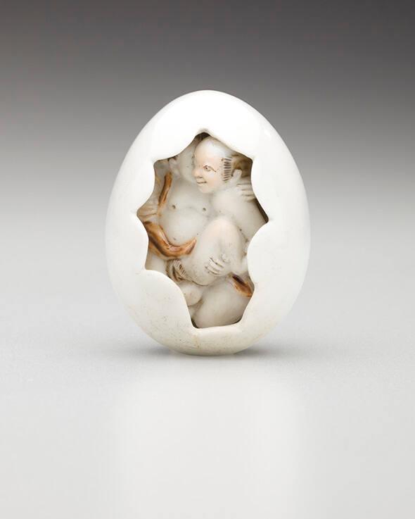 Netsuke: Amorous couple and octopus inside cracked eggshell