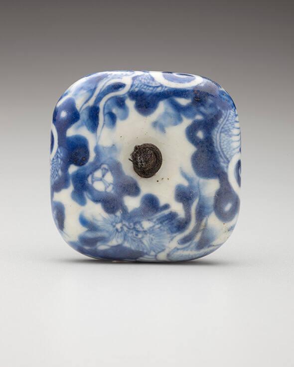 DescriptionLarge square Manju sometsuke Hirado. Kyoto ware; porcelain with clear glaze and blue underglaze (sometsuke).