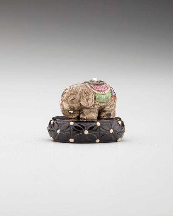 DescriptionSmall elephant polychrome on stand. Edo ware; earthenware with polychrome glazes, inlaid pearls, and carved black jasper.