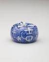DescriptionLarge Tangerine (Mikan) Seto-yaki with "Kichi" design. Kyoto ware; porcelain with clear glaze and blue underglaze (sometsuke).