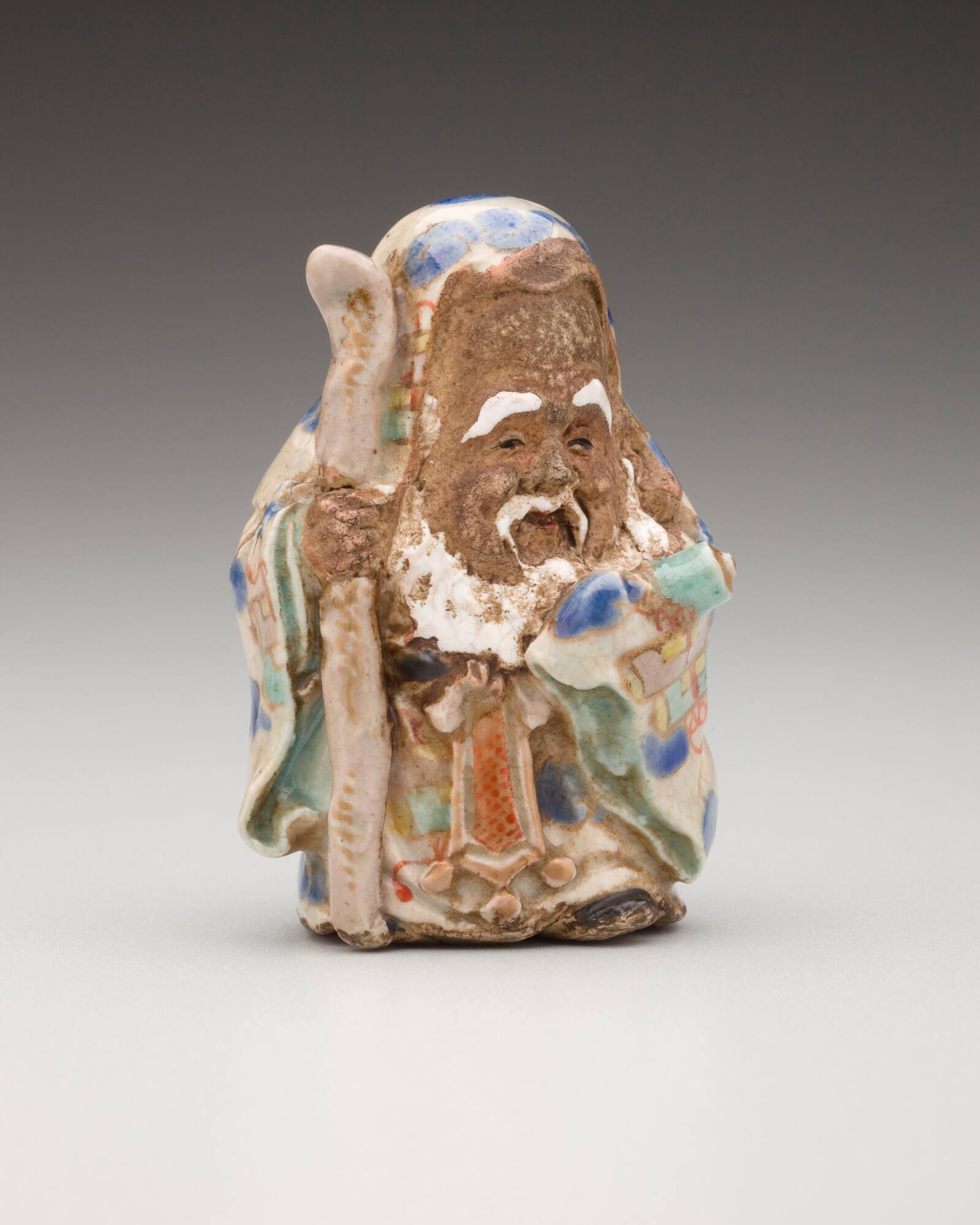 DescriptionLarge Fukurokuju. Kyoto ware; earthenware with polychrome glazes.