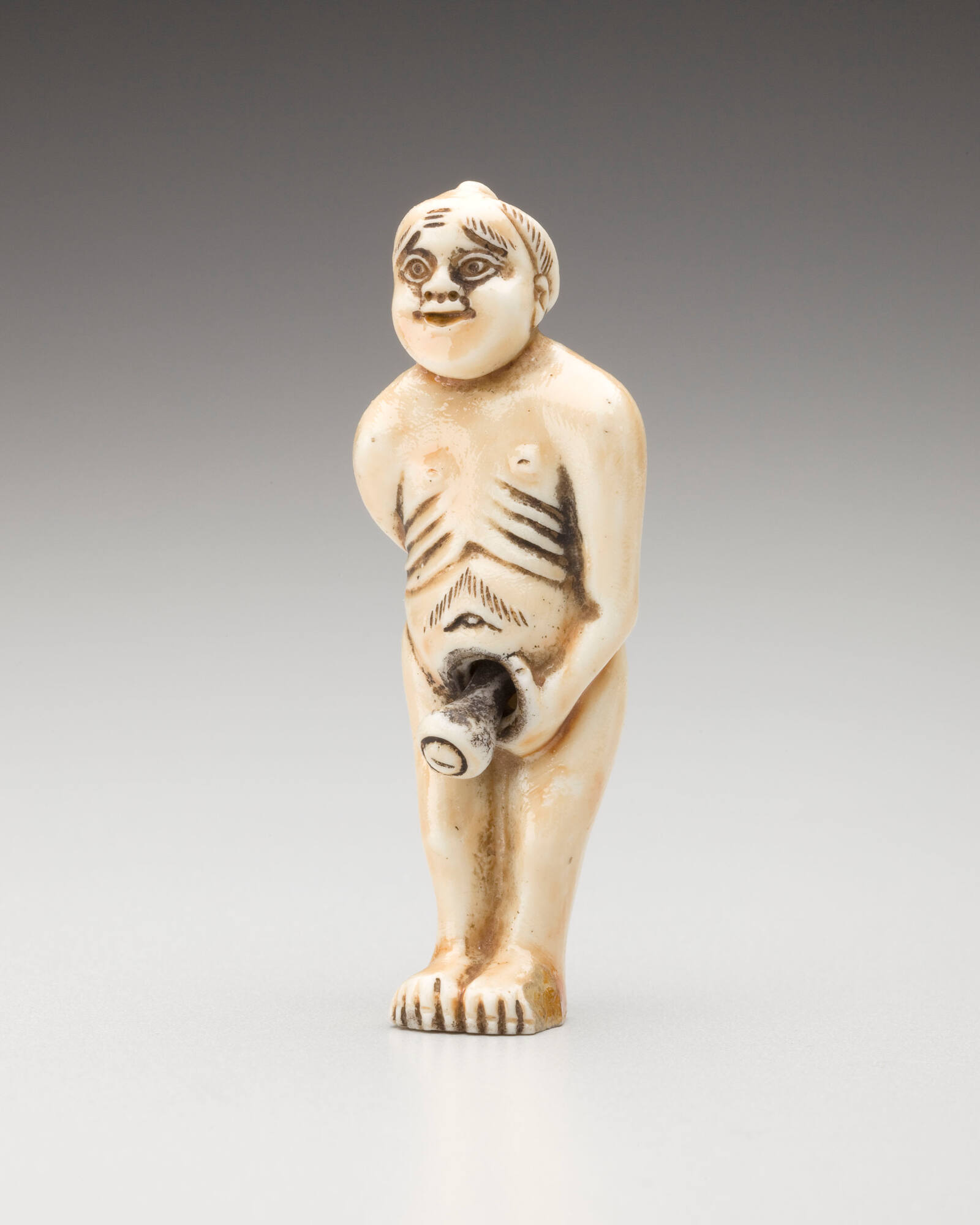DescriptionMan with moveable part. Hirado ware; porcelain with matte bisque glaze and stain.