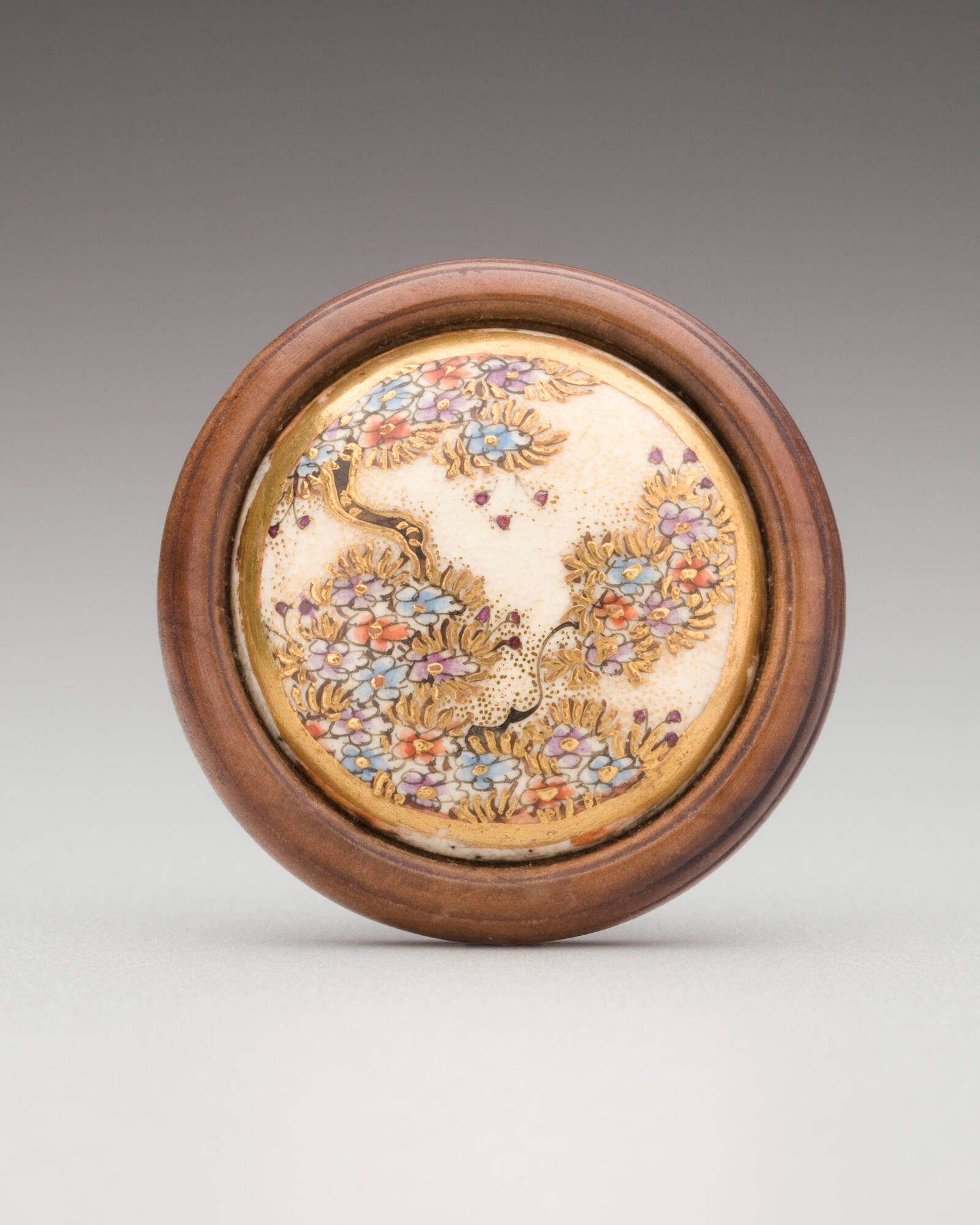 DescriptionSatsuma ware; earthenware with polychrome glazes and gold enamel, paulownia wood.