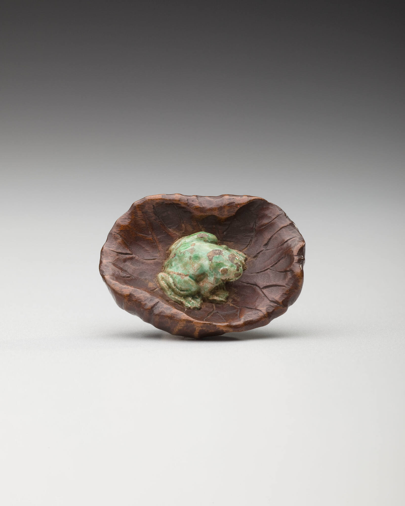 DescriptionGreen frog with wooden leaf. Edo ware; glazed porcelain with paulownia wood.