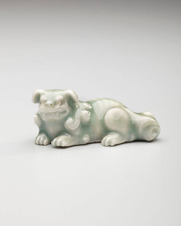DescriptionLong Reclining shi-shi. Nabeshima ware; porcelain with celadon glaze.
