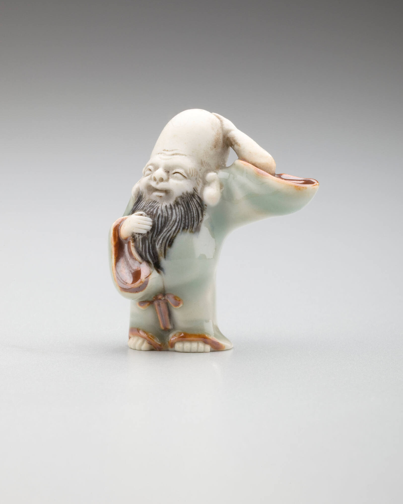 DescriptionJurojin with large stomach, left hand on head, right hand holding beard. Hirado ware; porcelain with bisque, black, brown, and celadon glazes.